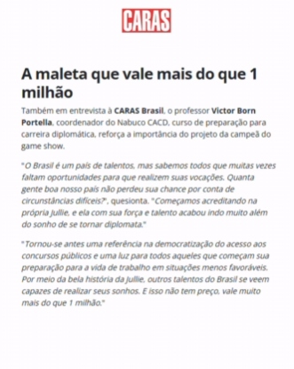 A Jullie conhece como poucos o poder transformador da educação, como fica evidente em suas iniciativas, como a Pequena Milionária. Fico muito contente de poder contribuir, via Curso REPI, para o projeto Maleta que Vale Mais de um Milhão e somar forças em favor de maior democratização do ensino no Brasil. Tanto o seu desempenho no Quem Quer ser o Milionário? como tudo o que ela vem fazendo desde sua conquista comprovam que Jullie será uma excelente diplomata, engajada em representar o Brasil e promover o desenvolvimento sustentável do País.
